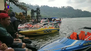 karena lelah berdiri terus lihat reog, istirahat sejenak melihat suasana air telaga ngebel dan ramai perahu speed boat.
